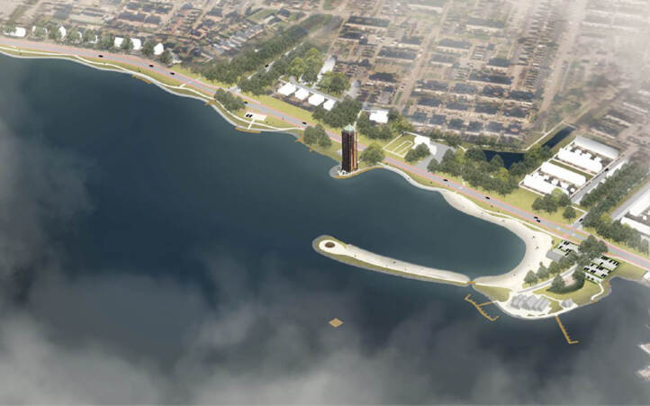 Nieuwe visualisatie van de Floriade Almere met in het midden de ReUseBrug, waar Arc2 architectuur het architectonisch ontwerp voor heeft gemaakt. Voor het karakteristieke ontwerp van het kunstwerk is op slimme wijze circulair gebruik gemaakt van bestaande infrastructuur.