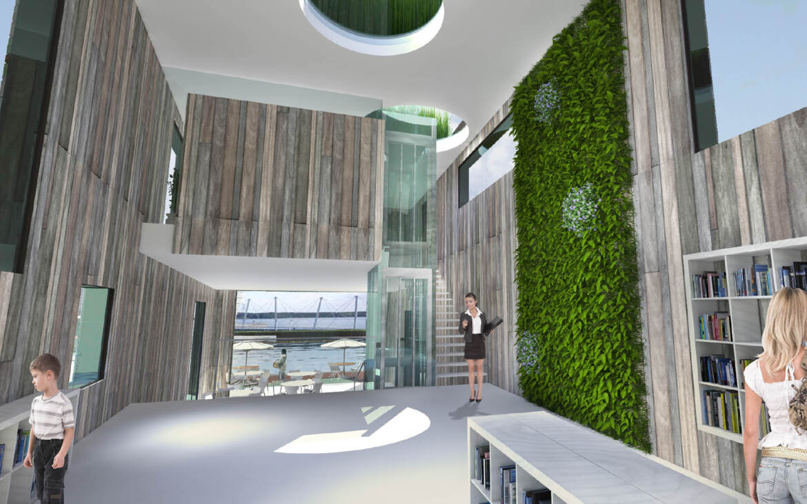 Het ontwerp sluit aan bij de Almere Principles, het cradle to cradle concept (C2C) met voorwaarden voor een aantrekkelijke, groene en duurzame stad. De instelling versterkt hiermee haar maatschappelijke rol door als voorbeeldfunctie te fungeren. De uitbreiding wordt gerealiseerd met lokaal geproduceerde of gereyclede natuurlijke materialen: de constructie van populierenhout, de gevelbekleding van hergebruikt pallethout en een interieur van lokaal sloophout. Op het dak wordt een innovatief landschap met de nieuwe technologie Plant-MFC toegepast waarmee stroom kan worden opgewekt en de lucht in de omgeving wordt gezuiverd. Het klimaat in het interieur wordt op een natuurlijke wijze verbeterd door een groene wand met planten.