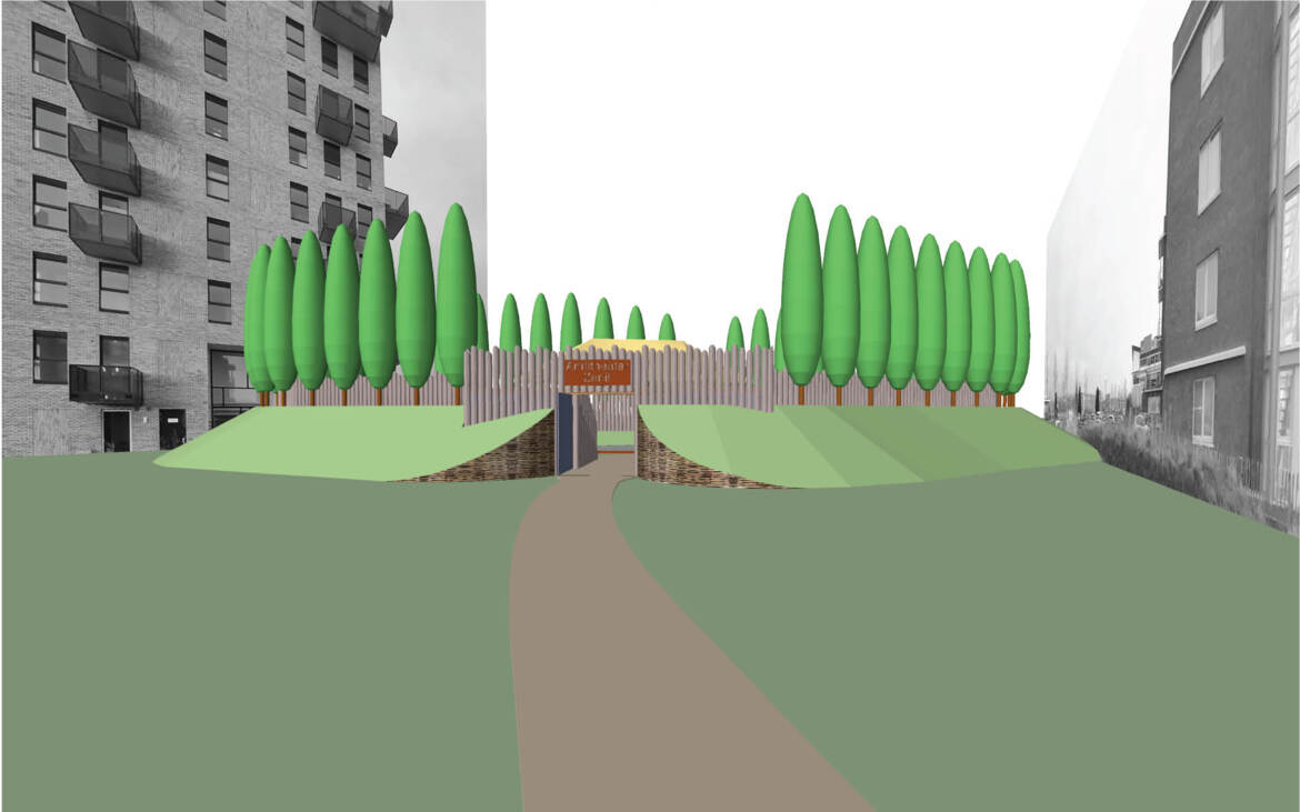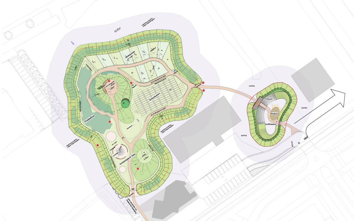 Het ontwerp van het Amfitheater bestaat uit een podium met een tribune voor ruim 120 zitplaatsen. Het Amfitheater is landschappelijk ingepast met de toepassing van natuurlijke en hergebruikte steenachtige materialen passend in de context. Een palisade met bomenrij markeren en omkaderen de archeologische plek in zijn stedelijke context.
