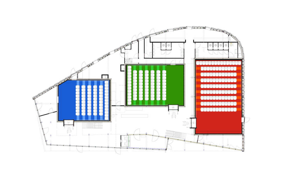 - De zalen moeten voornamelijk geventileerd en gekoeld worden. De koude lucht van buiten wordt opgewarmd met de warmte van de bezoekers zelf! Uiteraard is het gebouw optimaal geïsoleerd, zowel de gevels, de vloer als het dak;