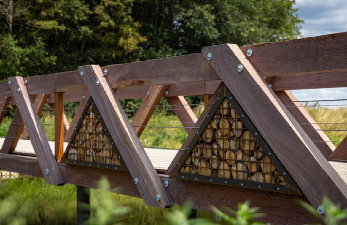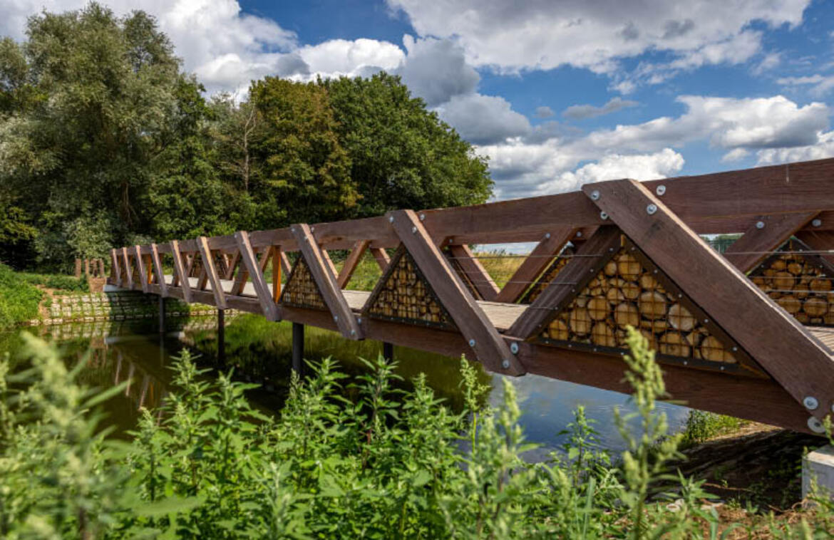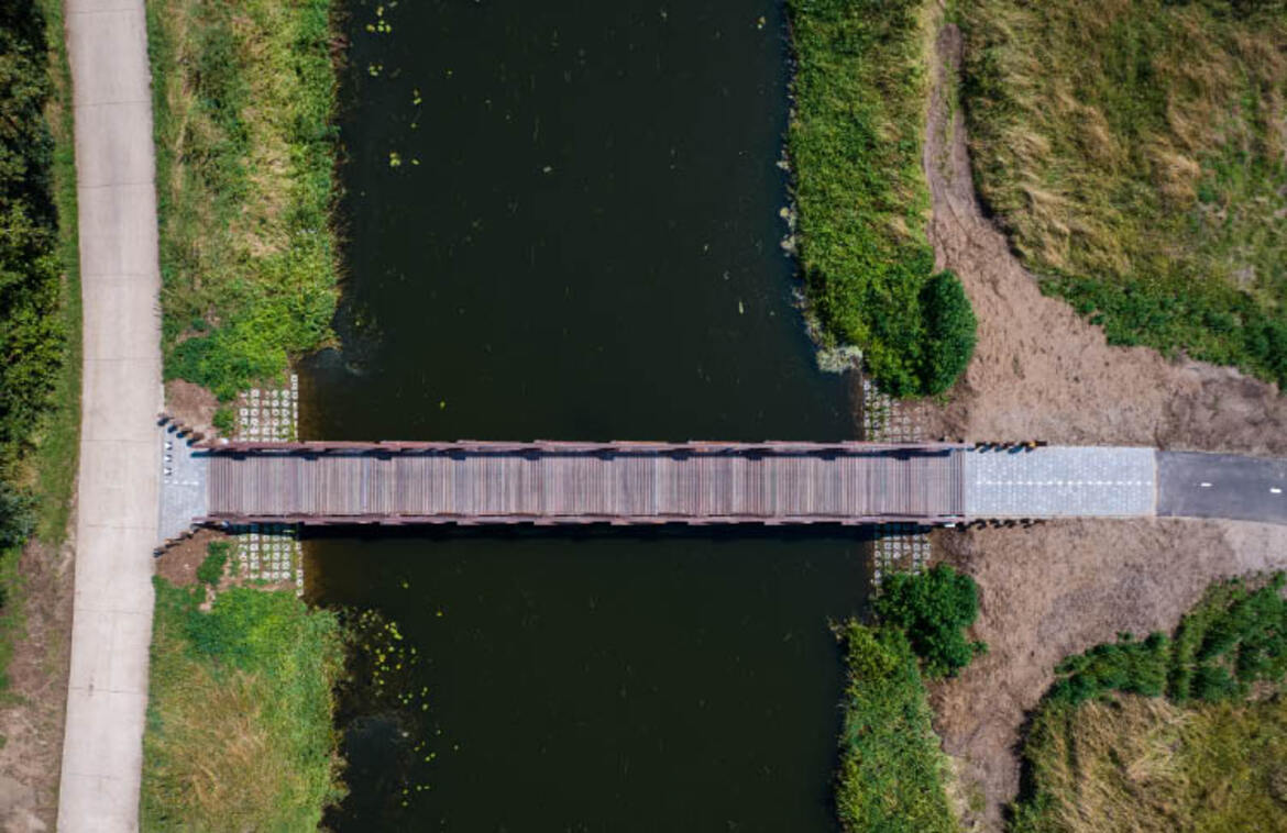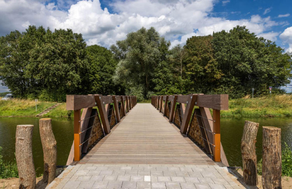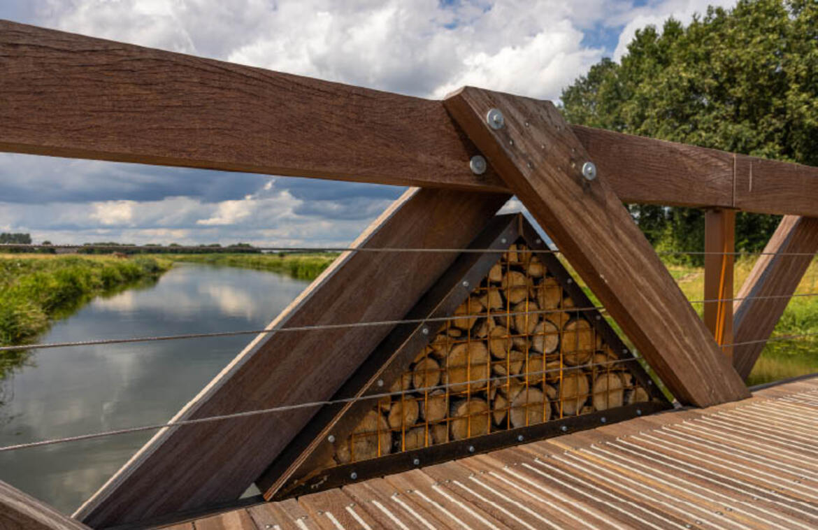 Het ontwerp van de fietsbrug over de A strang is functioneel met een eenvoudige vormgeving. Het vormt daarmee een direct verwantschap met de naastgelegen Klompsbrug. Het verschil met de verkeersbrug is dat de nieuwe fietsbrug geheel wordt gerealiseerd met circulaire en biobased materialen. Passend bij de recreatieve functie en de duurzaamheidsambitie van de gemeente vormt hierin het natuurlijke materiaal hout de basis. Efficient materiaalgebruik vormt hierbij het uitgangspunt en waar mogelijk zijn hergebruikte materialen toegepast voor een tweede leven om het winnen van nieuwe grondstoffen te beperken. Om met de brug naast functionele oversteek van meerwaarde te zijn aan de omgeving is de leuning van het kunstwerk deels ingevuld met BioFrames. Met de insectenhotels wordt een bijdrage geleverd aan de biodiversiteit in het gebied en de ecologische waarden versterkt.