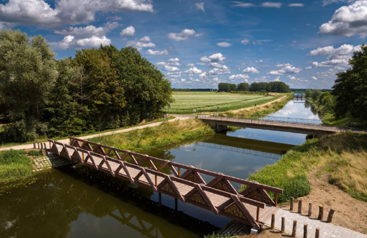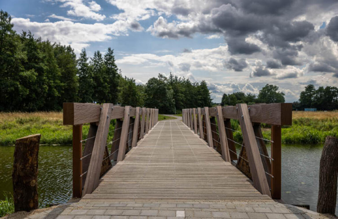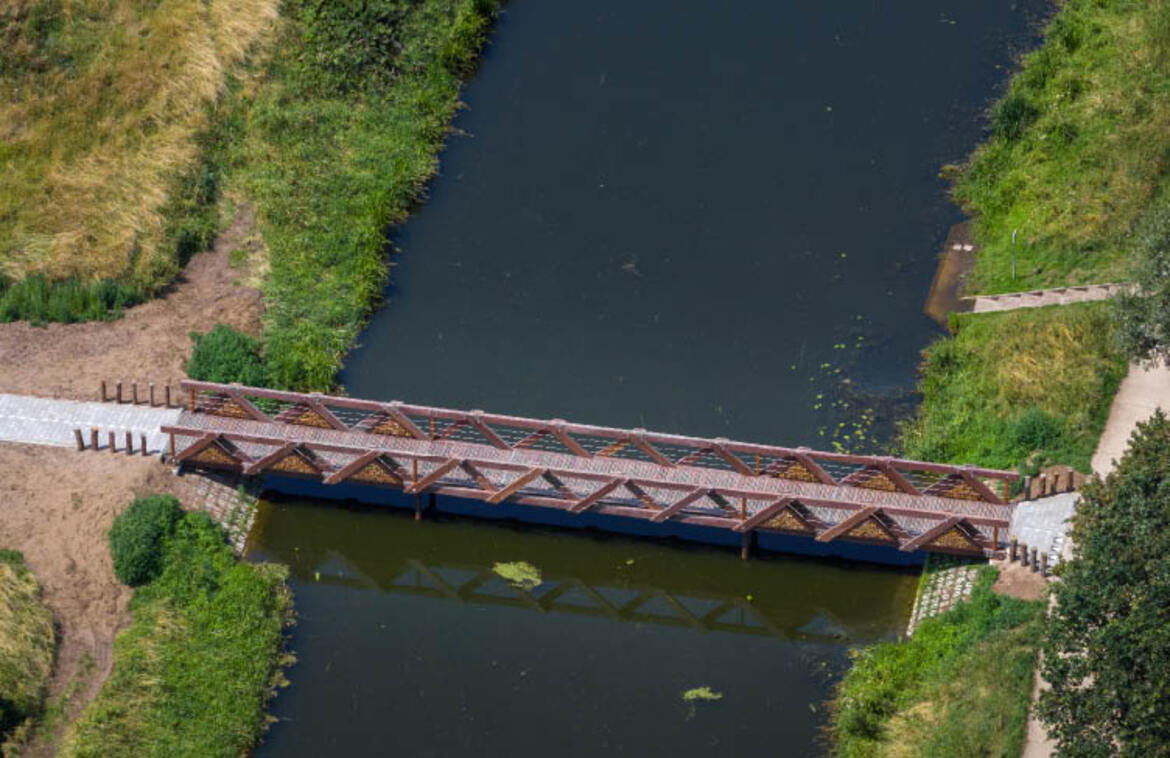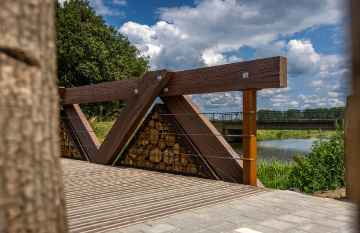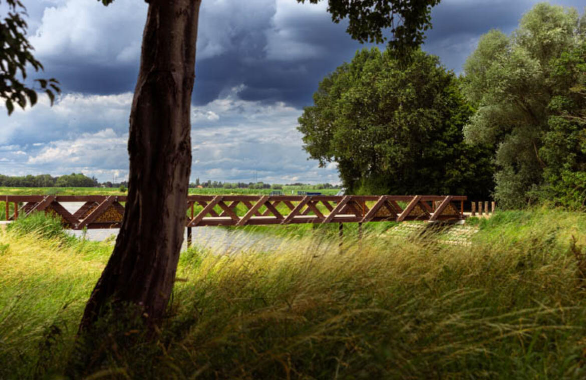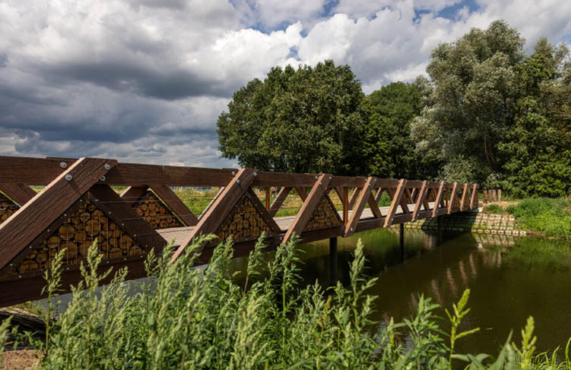 Het ontwerp van de fietsbrug over de A strang is functioneel met een eenvoudige vormgeving. Het vormt daarmee een direct verwantschap met de naastgelegen Klompsbrug. Het verschil met de verkeersbrug is dat de nieuwe fietsbrug geheel wordt gerealiseerd met circulaire en biobased materialen. Passend bij de recreatieve functie en de duurzaamheidsambitie van de gemeente vormt hierin het natuurlijke materiaal hout de basis. Efficient materiaalgebruik vormt hierbij het uitgangspunt en waar mogelijk zijn hergebruikte materialen toegepast voor een tweede leven om het winnen van nieuwe grondstoffen te beperken. Om met de brug naast functionele oversteek van meerwaarde te zijn aan de omgeving is de leuning van het kunstwerk deels ingevuld met BioFrames. Met de insectenhotels wordt een bijdrage geleverd aan de biodiversiteit in het gebied en de ecologische waarden versterkt.