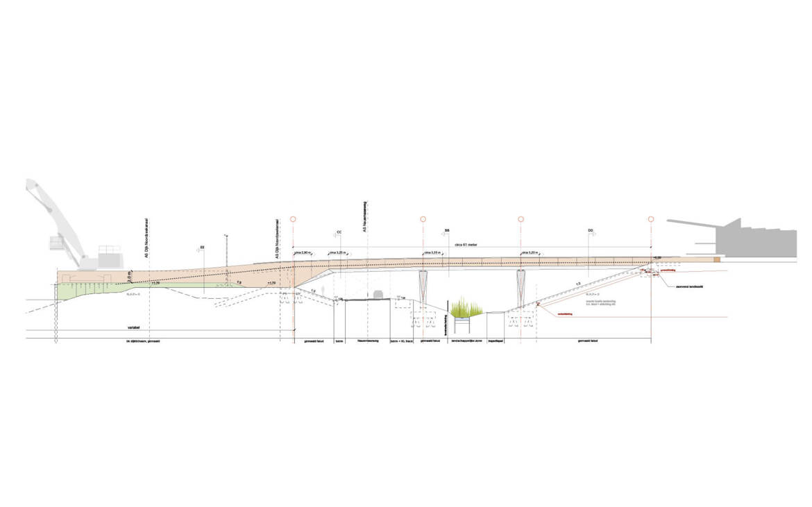 Ook constructief gezien is het kunstwerk een hoogstandje. De constructie van het dek zonder onderslagbalken door middel van een natte knoop tussen de prefabfliggers vergroot het doorzicht en versterkt de continuïteitvan het dek. De oplegging aan de zijde van de stortlocatie is niet onderheid met een paalfundering maar steunt op het stortlichaam en kan indien noodzakelijk tussentijds worden bijgesteld.