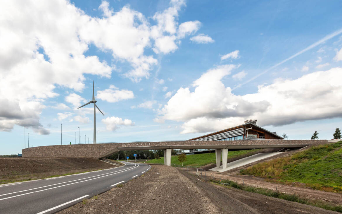 De scherpe lijnen en vouwen in de constructieve elementen (landhoofd, onderzijde brugdek, brugranden en kolommen) van het viaduct vormen een echo van de (onder-) doorgaande scherpe lijnen in het taludlandschap, het maakt een krachtig gebaar passend bij het zware materieel (industriefunctie) dat gebruik maakt van deze oversteek en biedt maximaal zicht op het omringende landschap. De schuine aansnijding in het landhoofd accentueert de dynamische sprong over de randweg en biedt ruimte aan een informeel klompenpad dat doorloopt onder de brug op kruinniveau. De taluds onder de brug zijn ingevuld met een halfverharding. De bekleding wordt opgenomen in het bestaande landschap, waardoor de continuïteit van de begroeide langgerekte taluds zo min mogelijk wordt onderbroken. Het groene landschap loopt daarbij zover mogelijk onder de verbinding door.