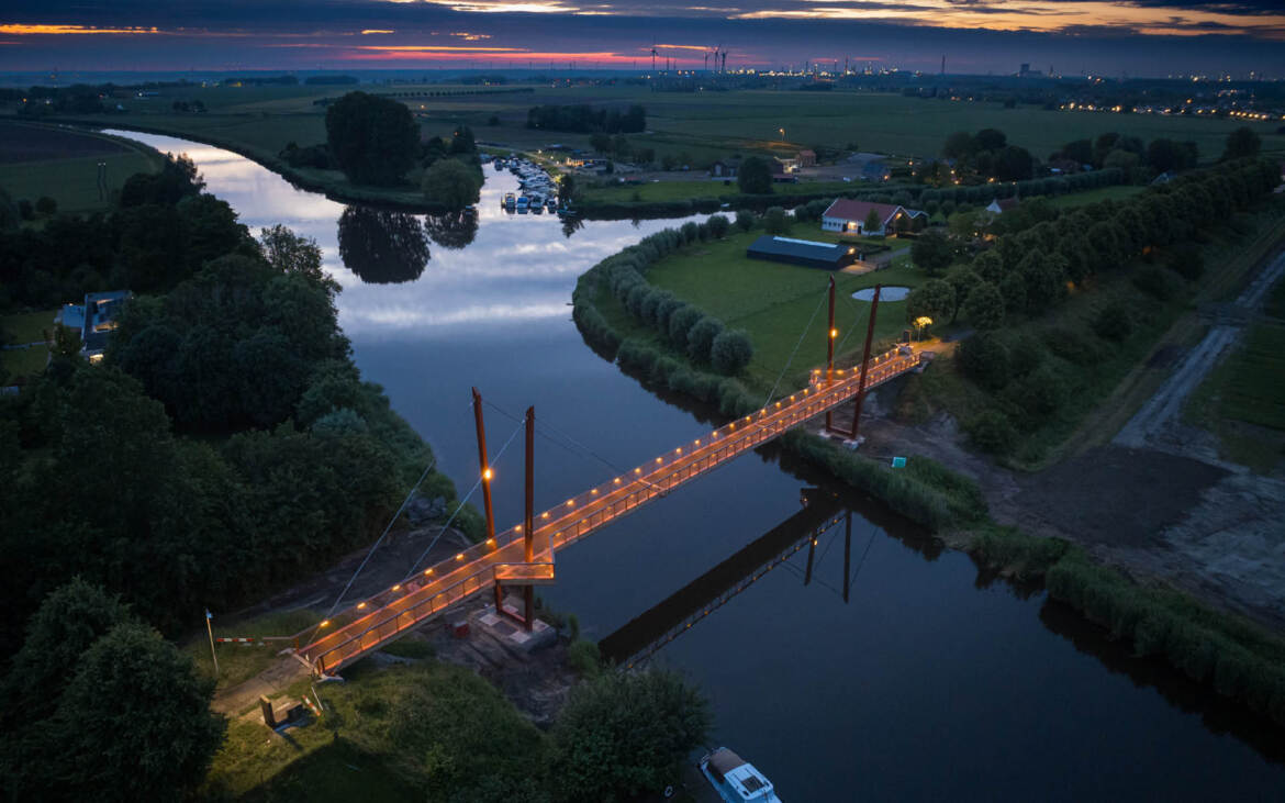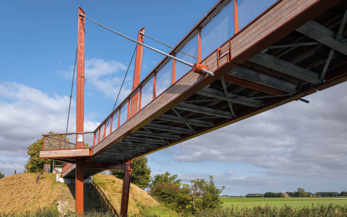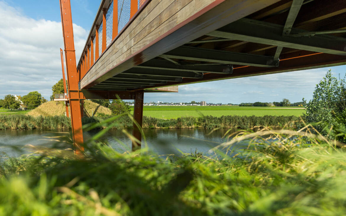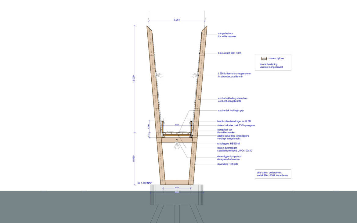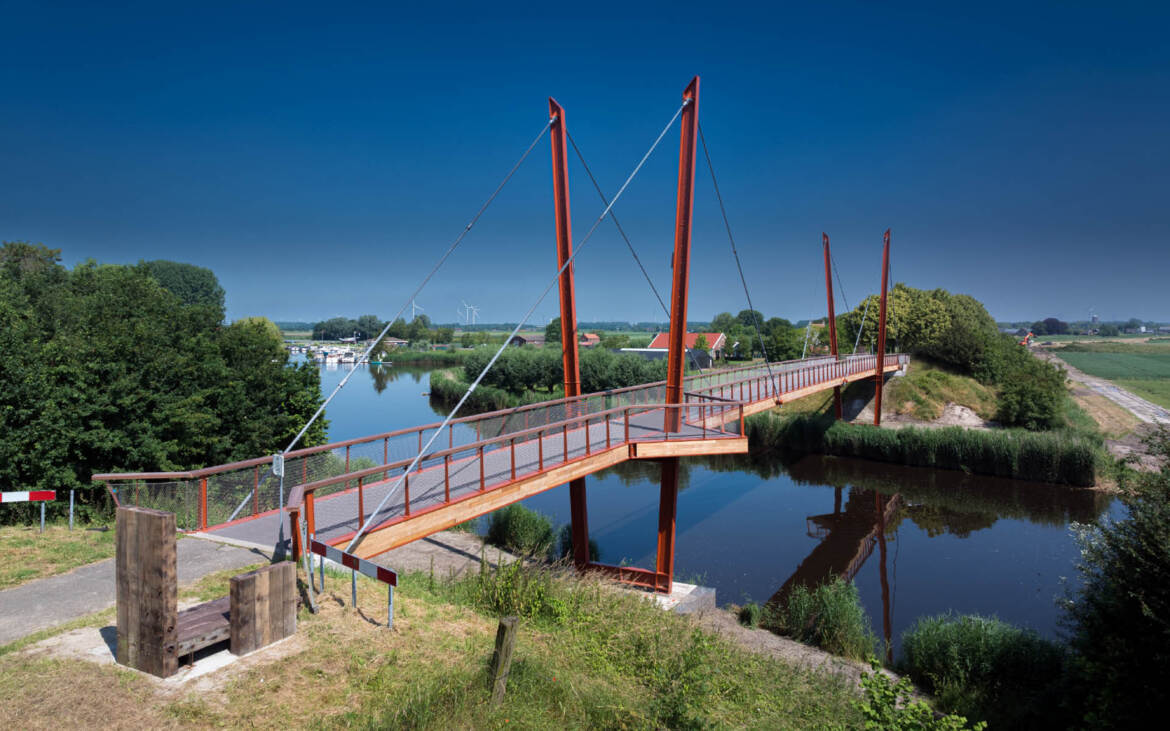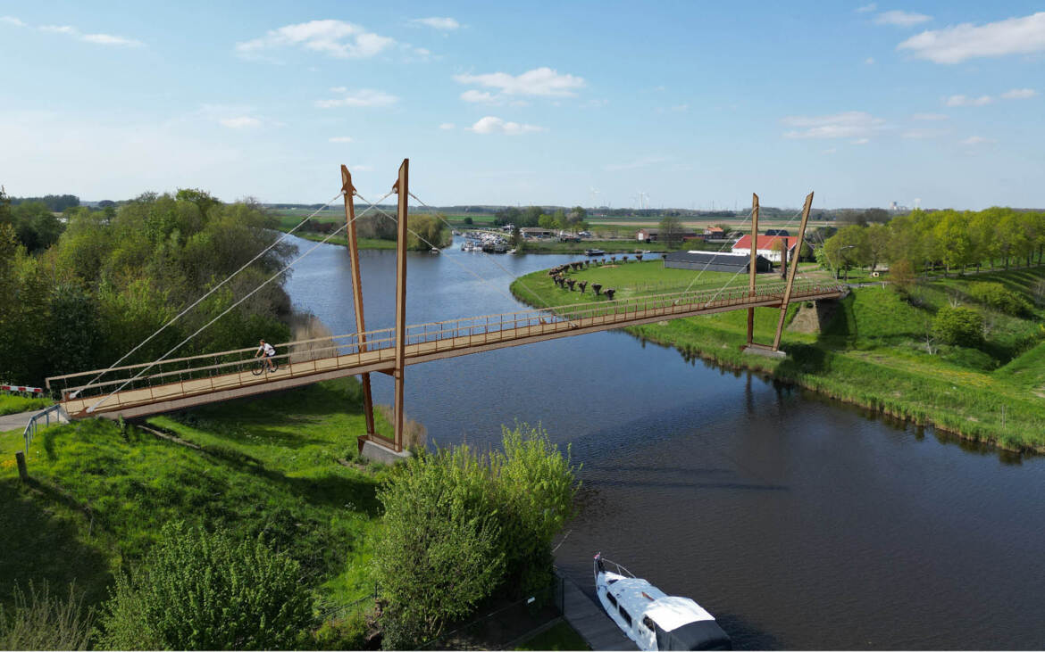 In de basis is het ontwerp van de brug op een sobere en functionele wijze opgezet en maakt de oversteek op de meest efficiënte wijze door middel van een stalen tuiconstructie op basis van de bestaande funderingspunten. Het ontwerp is een eigentijdse versie van de oude brug met een elegantere en transparantere en circulaire vormgeving en detaillering maar met behoud van het silhouet en kwaliteiten als landmark. De brug heeft een recreatief karakter door de veelvuldige toepassing van hout in de afwerking die het verblijf op de brug aangenaam maken: een houten dek, een houten invulling van de pylonen en een houten handregel die plezierig is om vast te houden en op te leunen. Leunend op de handregel kunnen de gebruikers genieten van het spectaculaire uitzicht over het landschap. De transparante vormgeving van de leuning versterkt de beleving dat men één geheel vormt met de prachtige groen-blauwe wereld van de rivier. Enkele goene led-spots zorgen voor een subtiele verlichting van de binnenzijde van de pylonen waarmee de brug ook in de avond zichtbaar is. De brug bestaat voor maar liefst voor 80% uit hergebruikte materialen.