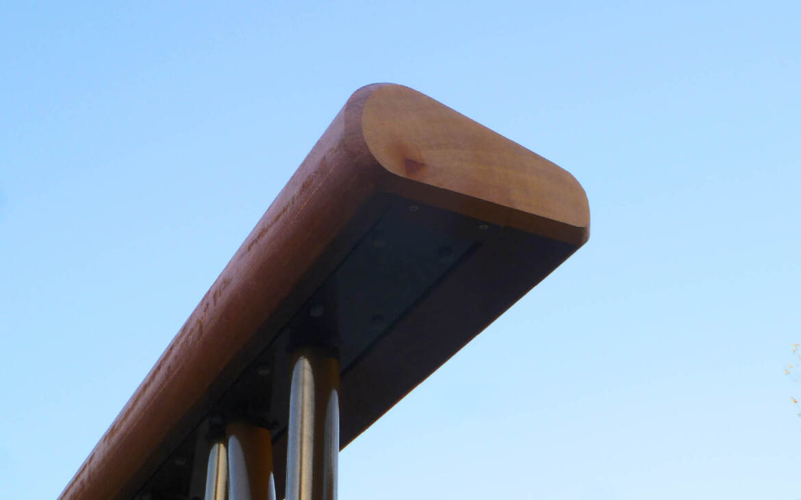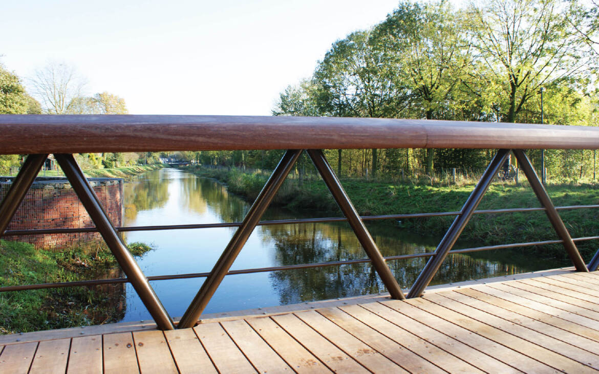 - De houten bovenregel is afgerond en extra breed om de voetganger uit te nodigen om erop te leunen en te genieten van een blik op het riviertje;