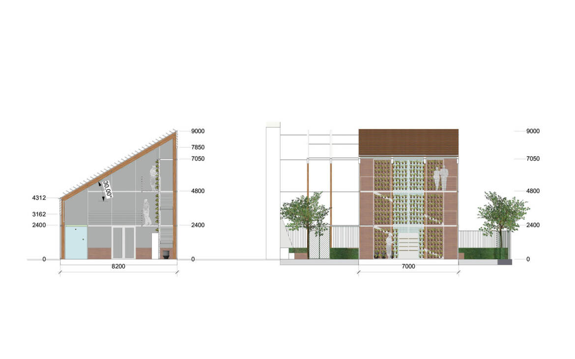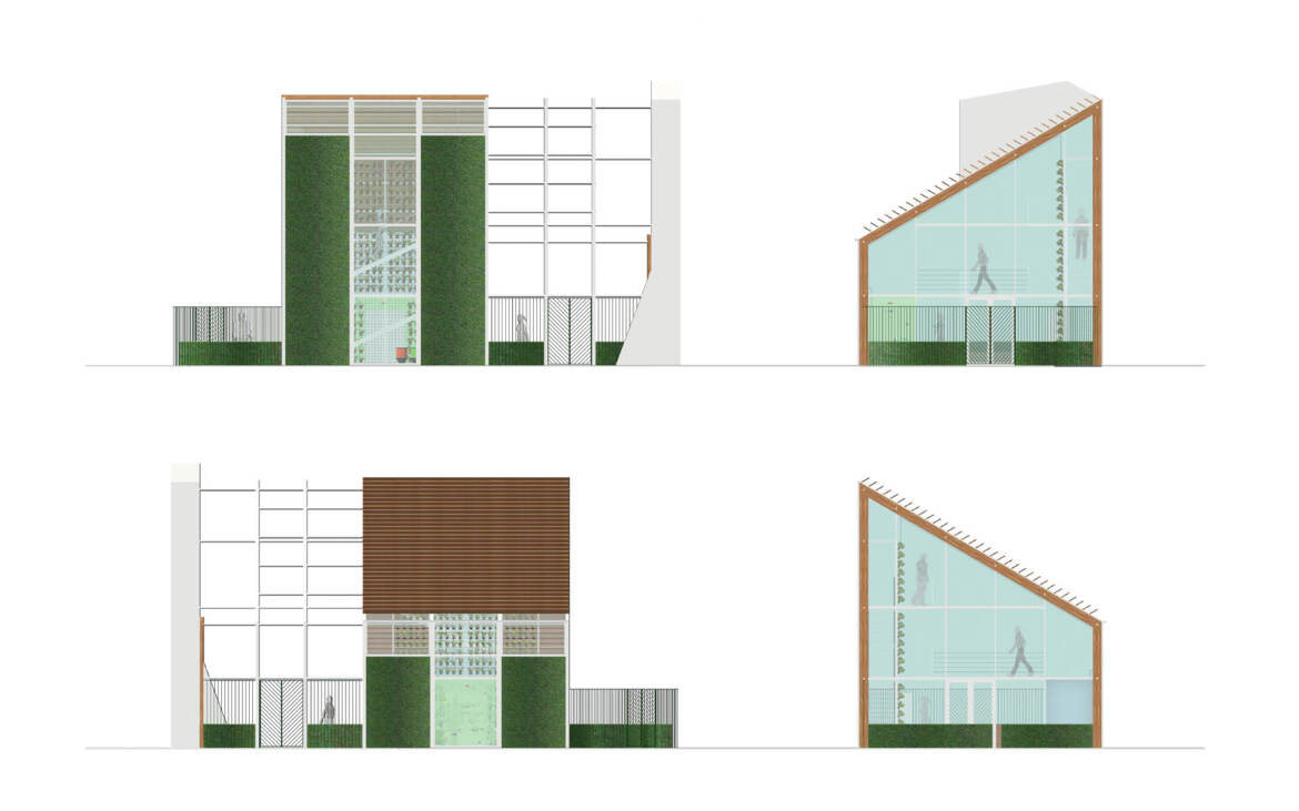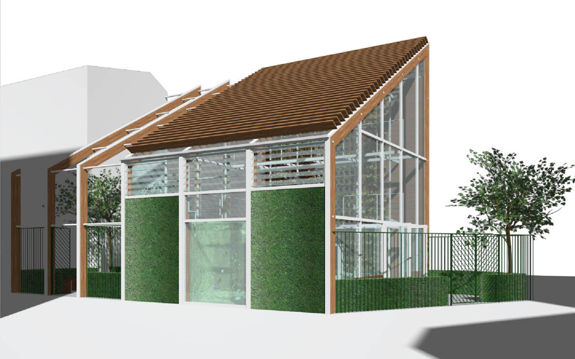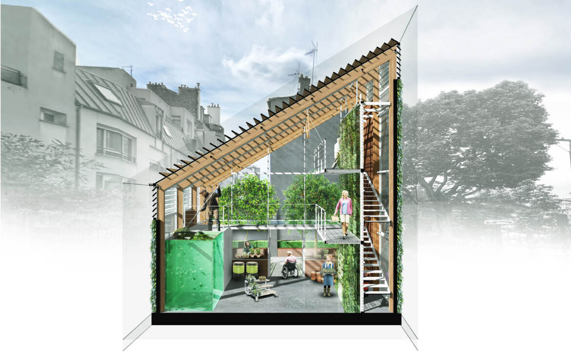 In een multidisciplinair team hebben wij (InnoPlant, Jean-Pierre Bremond, Atelier Masse & Arc2 architectuur) een ontwerp gemaakt voor een stedelijke kas midden in Parijs. De locatie op ‘Square des Tulipes’ betreft een plek waar een locale vereniging van buurtbewoners samen planten gaat vermeerderen die ze weer kunnen uitdelen aan hun leden. In het ontwerp hebben we een grote indrukwekkende verticale muur ontworpen waar containers in bakken gehangen kunnen worden. In elk potje zit een plantje die daar opgroeit en vervolgens meegenomen kan worden door leden. De watergift is op eenvoudige wijze gereguleerd. Planten zullen altijd voldoende water hebben, niet te droog en niet te nat. Lekker makkelijk voor de vrijwilligers. Aan de donkere zijde van het gebouw links is een waterbak neergezet die regenwater opvangt. Dit water wordt gebruikt om langs de planten te leiden aan de verticale muur. In combinatie met visteelt (aquaponics) is er een prachtig aquarium toegevoegd aan de ruimte. Het water van de vissen werkt als meststof voor de planten. In de schaduwzijde kan met kiemkasten worden gewerkt. Een soort koelkast waar de zaden, die leden van planten verzameld hebben uit hun omgeving, worden opgekweekt tot zaailing. Dit gaat altijd goed in de kiemkamers. Zo blijft de ruimte open voor het ontvangen van schoolkinderen én is de hele ruimte toegankelijk voor rolstoelrijders. De trappen zijn aan de achterzijde van de groene wand geplaatst. De loopbruggen zijn zo ontworpen dat ze het zonlicht doorlaten.