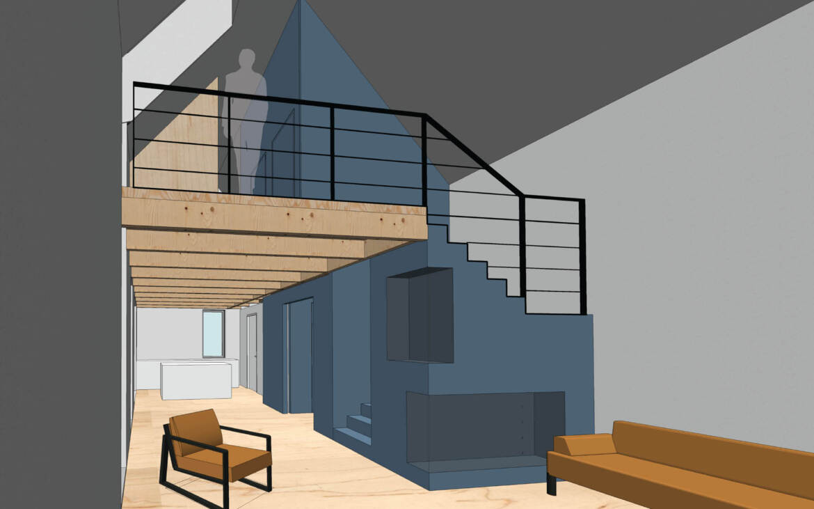 In het interieur draagt een vide in de woonruimte bij aan de gewenste ruimtelijke loftbeleving van het woonhuis, waarbij de trap onderdeel vormt van een centraal blok. Het contrast in afwerking in kleur en materialisatie laten de ruimten visueel doorvloeien.