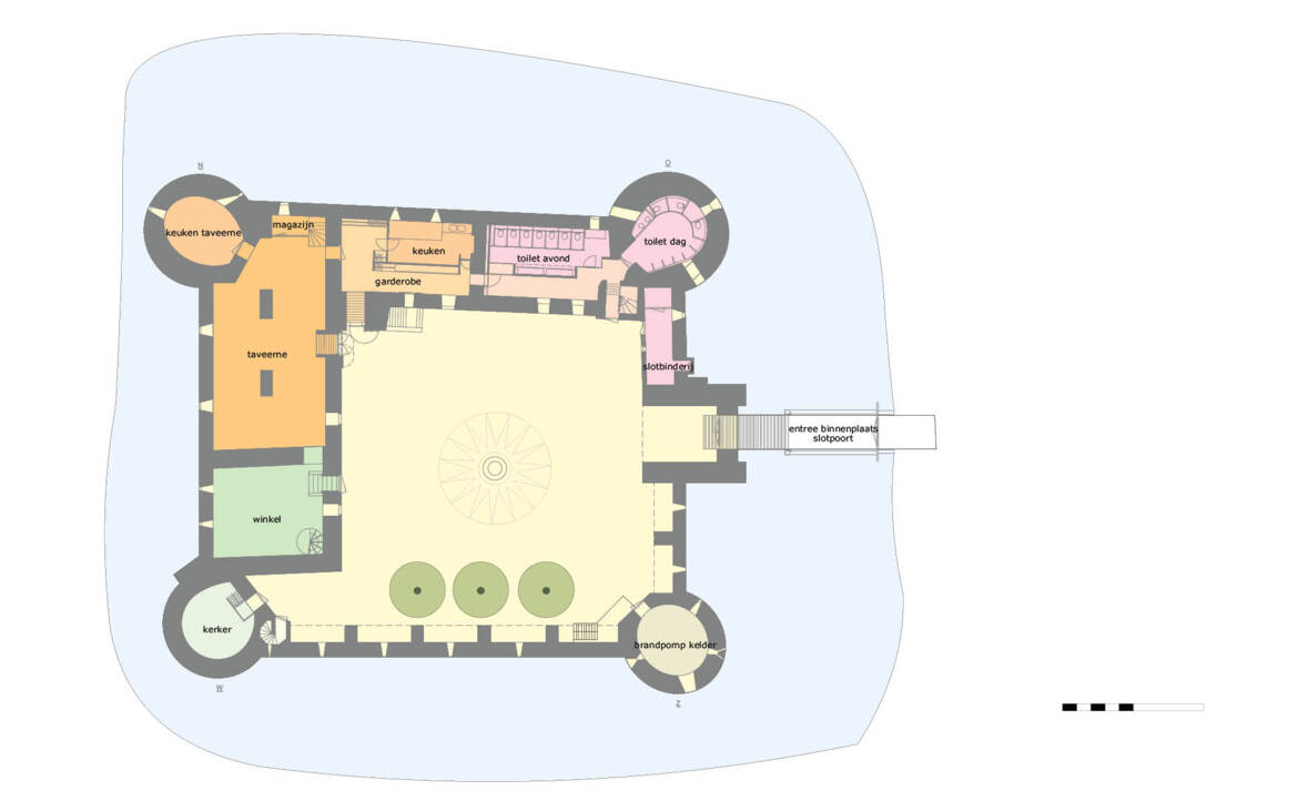 Stichting Rijksmuseum Muiderslot heeft Arc2 architectuur gevraagd om middels een variantenstudie onderzoek te verrichten naar mogelijke inbreidingsoplossingen in het Muiderslot. Er is een Programma van Eisen opgesteld, een bezonningsstudie gemaakt en er zijn een viertal schetsontwerpen vervaardigd. De ontwerpen zijn in beeld gebracht aan de hand van plattegronden, gebruiksschema's en impressies.