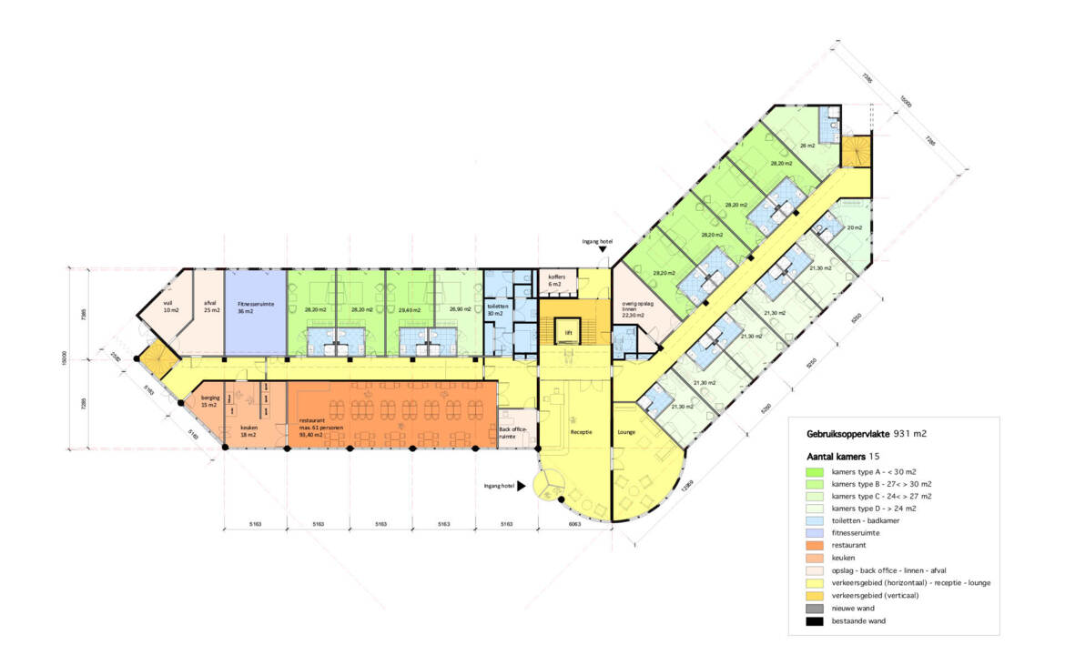 Door Arc2 architectuur is het transformatie ontwerp gemaakt voor de nieuwe indeling van het voormalige kantoorgebouw. Als uitgangspunt is gehanteerd dat de gevelindeling van het gebouw ongewijzigd bleef: de positie van de raamopeningen vormen de basis voor de ligging en de indeling met kamers. Er is een mix van kamers met verschillende afmetingen ingepast. De hotelkamers hebben allemaal hun eigen sanitaire unit met douche en toilet. De kamers voldoen aan een drie-sterren niveau. Het merendeel van de kamers heeft een oppervlak van 27,6 m2, daarnaast zijn er enkele familiekamers en eenpersoonskamers ingepast. Op de begane grond bevinden zich de ontbijtruimte, fitnessruime en serviceruimten. Ook de bestaande installaties zijn zoveel mogelijk hergebruikt. De ventilatie van de kamers vind plaats via kanalen in de centrale gang en de bestaande ventilatieschachten in het gebouw.