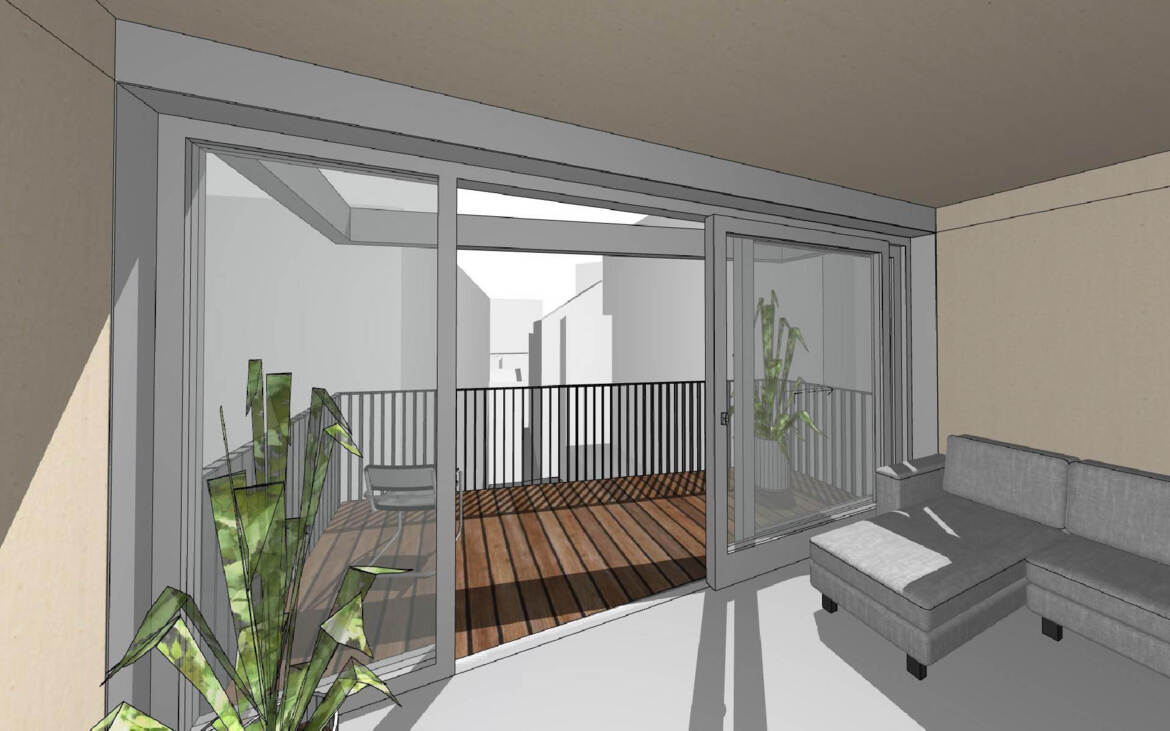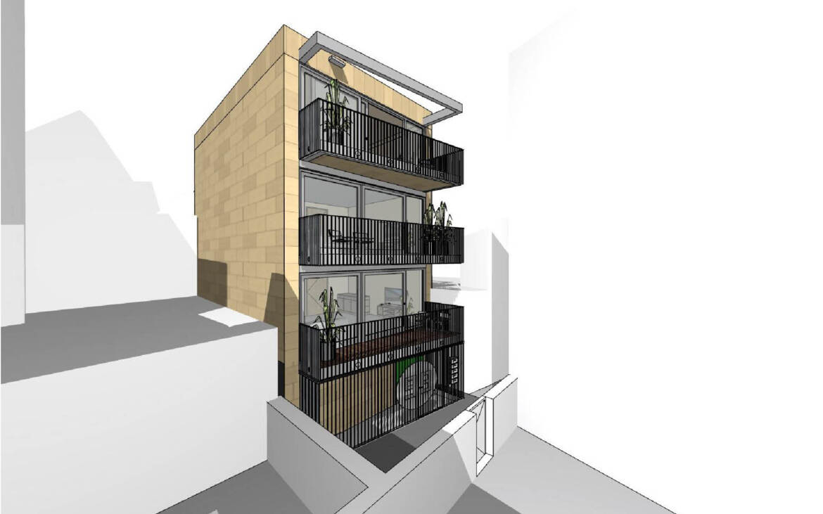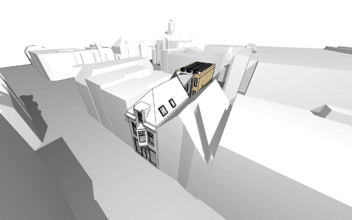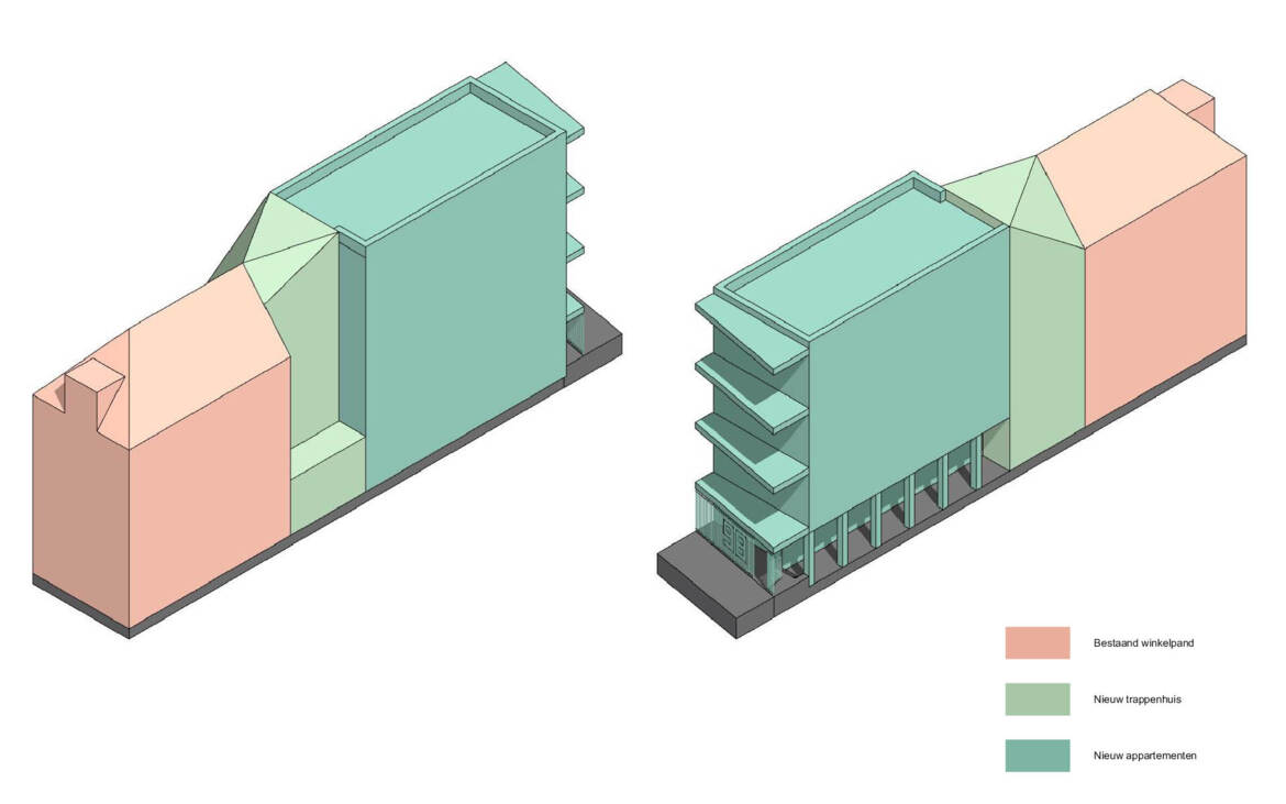 Voor een ontwikkelaar is een architectonisch ontwerp gemaakt van een gedeeltelijke transformatie en uitbreiding van een bestaand pand in het centrum van een stad. De verdieping boven de winkel wordt in het plan herbestemd tot woonlaag, tegen de achterzijde van het bestaande gebouw wordt een vierlaagse uitbreiding met appartementen gerealiseerd. De nieuwe appartementen worden zoveel mogelijk met prefab elementen gebouwd om de binnenstad tijdens de bouw te ontlasten.