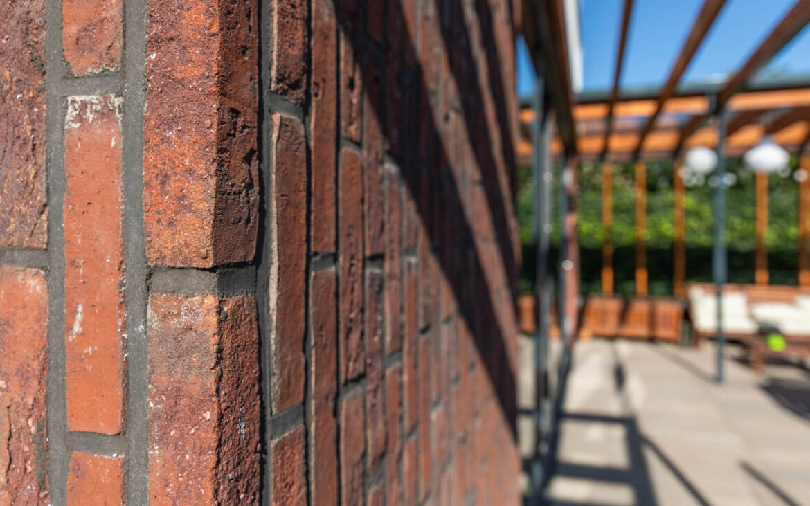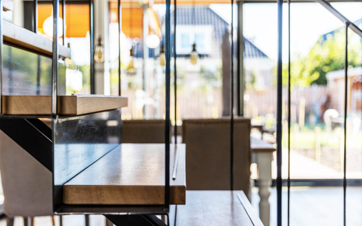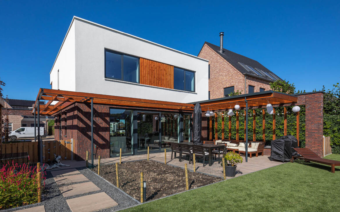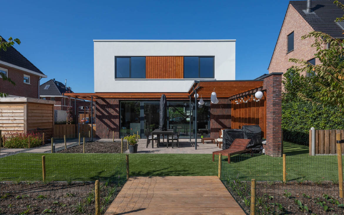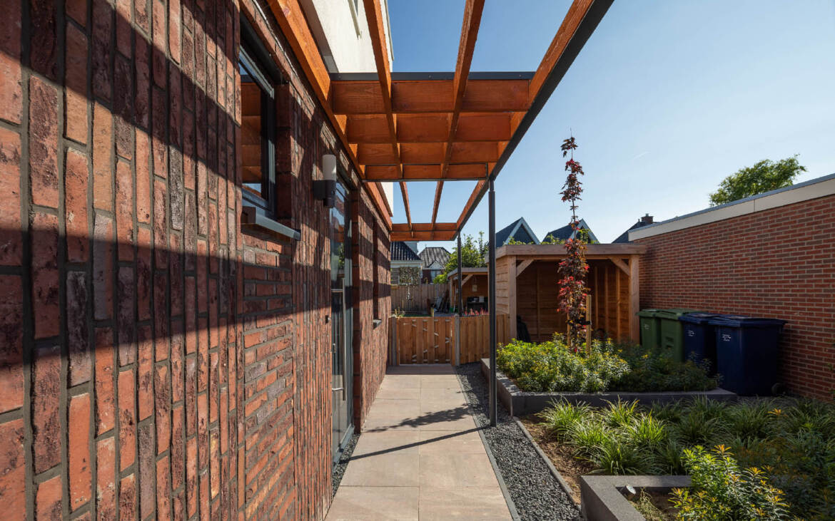 Rondom het huis vormt een houten frame met transparante beglazing beschutting in de vorm van een overkapping boven het terras en luifel ter plaatse van de entree.