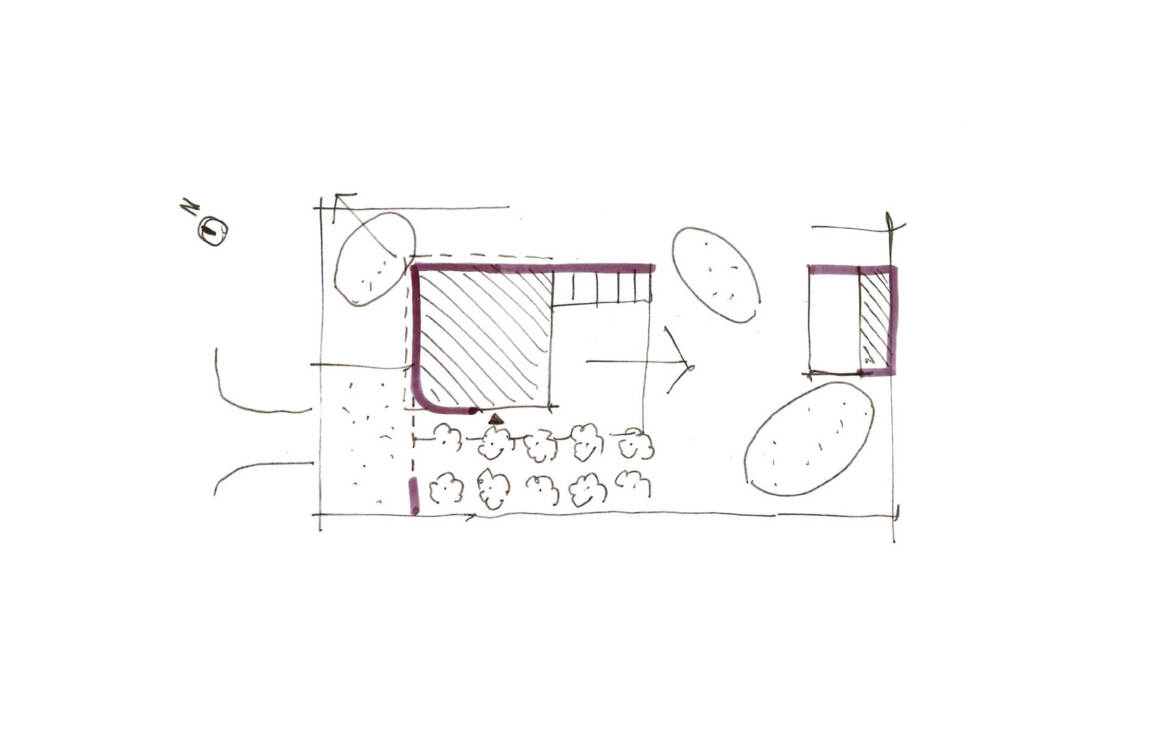 De masterbedroom en badkamer aan de noordzijde van het huis hebben beide open hoeken waardoor ochtend- en avondzon de verschillende ruimten bereikt en er vanuit deze ruimten diagonaal zicht is op de straat.