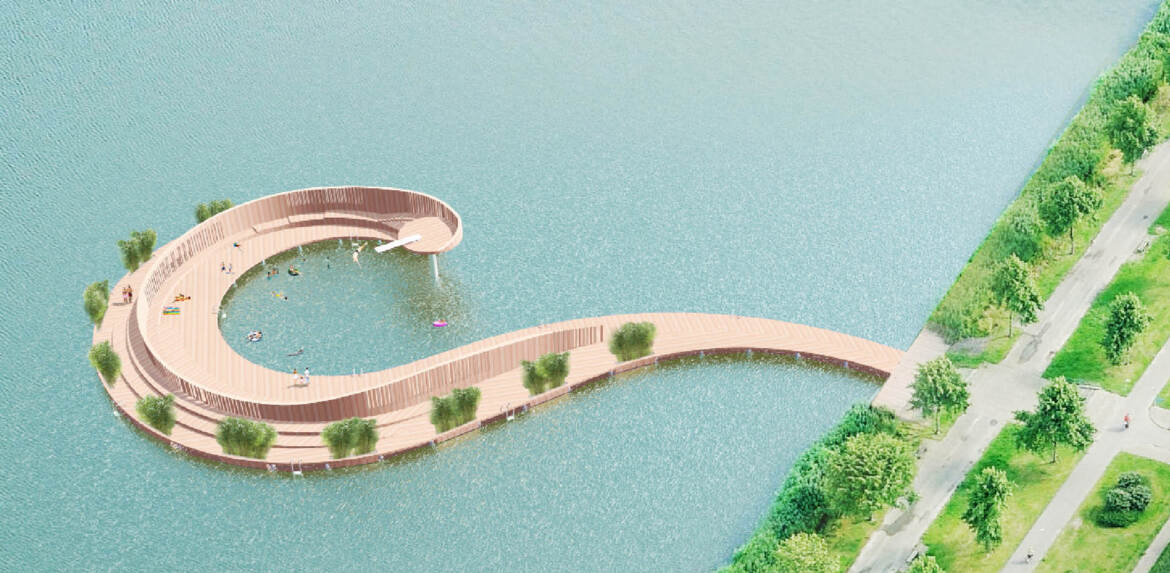 Pier voor het recreaeren in open water. gebouwd van gerecycled hout. Crowdfunding. Bewegen in de natuur.