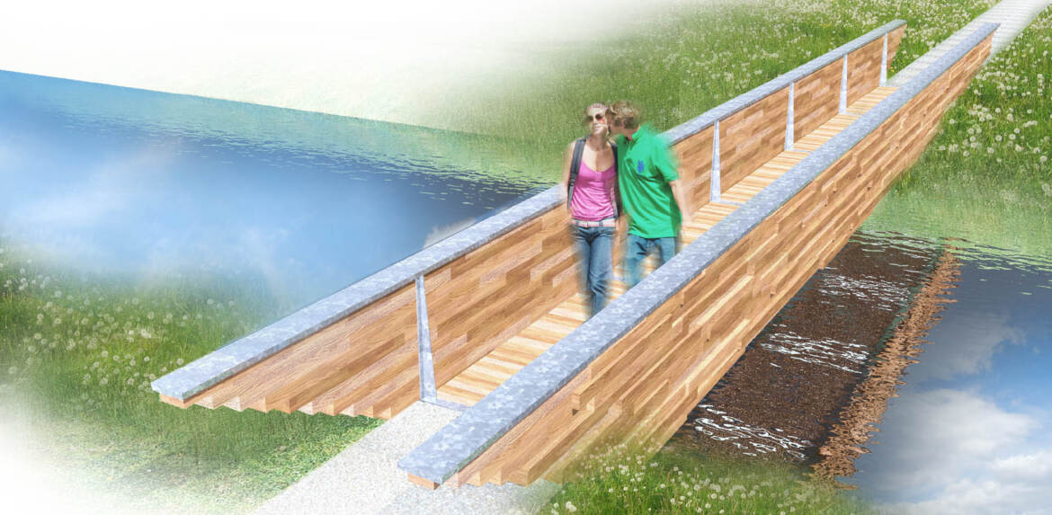 Brug gemaakt van hergebruikt FSC hardhout van oa. damwanden, sluisdeuren, meerpalen en bruggen.