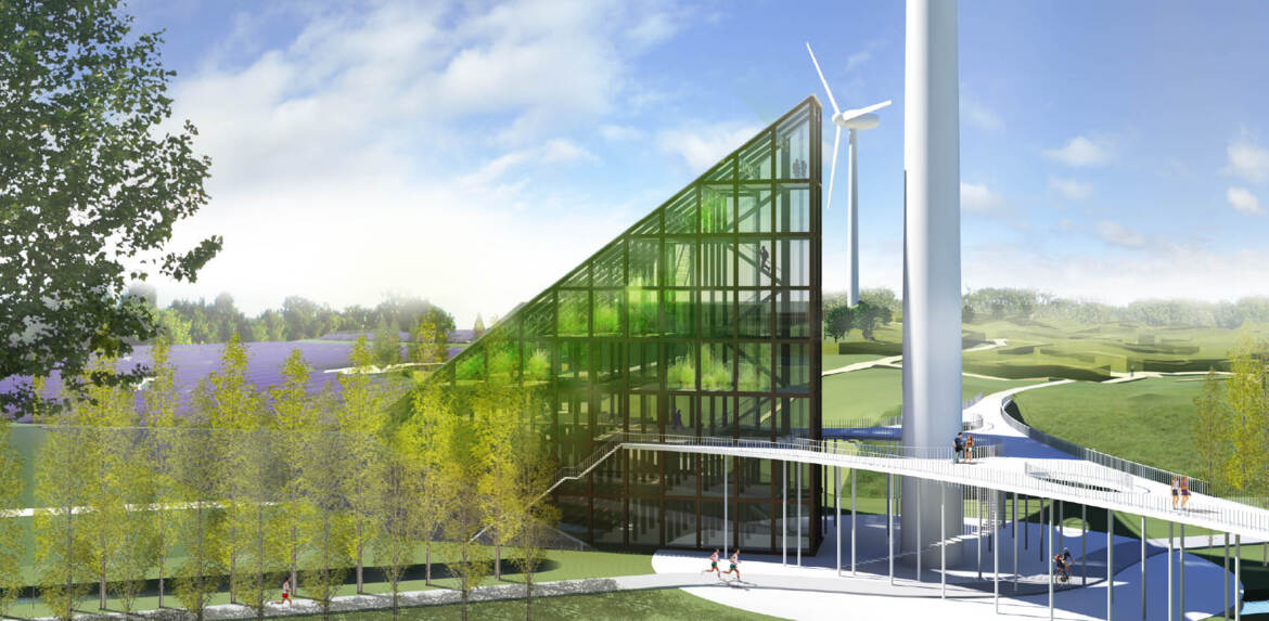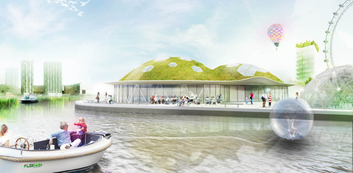 Congres, restaurant, groentekas, drijvend bouwen, zelfvoorzienend.